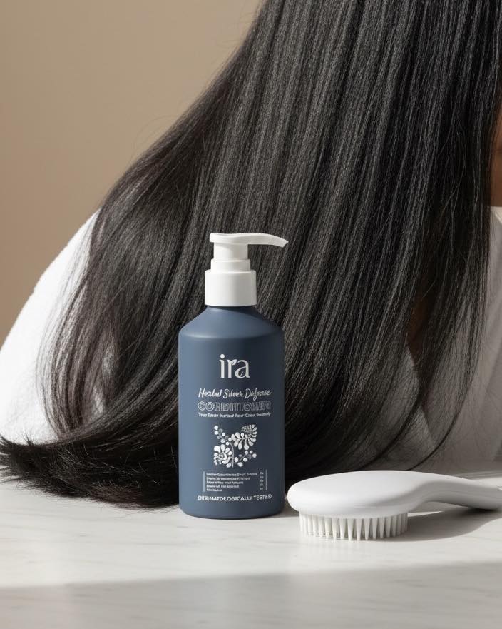 Ira Herbal Silver Defense Conditioner incorporates false daisy to support scalp balance and long-term hair vitality.