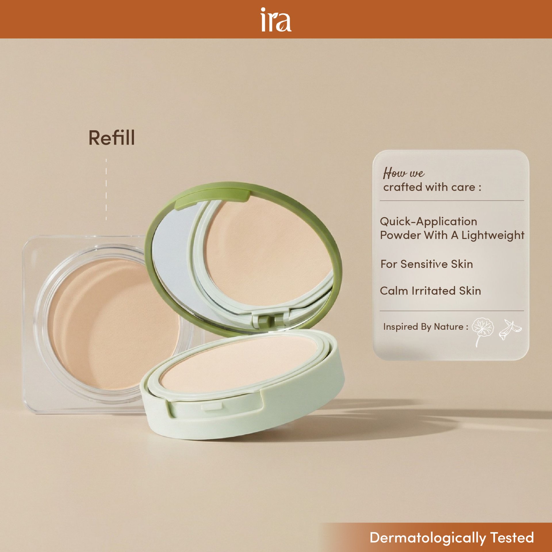 ปลอบประโลมผิวเป็นสิว ผิวแพ้ง่ายอย่างเป็นธรรมชาติด้วยแป้งพัฟไอราสูตร แอคเน่-พรอน สกินจากสารสกัดธรรมชาติ อาทิ สารสกัดใบบัวบก สารสกัดเปลือกมังคุด และวิตามินซี นอกจากนั้นยังช่วยให้ผิวหน้าของคุณผ่อง เนียน แต่บางเบาอีกด้วย ไอรา โกลว์ เอนฮานซิ่ง พาวเดอร์ ฟาวน์เดชั่น ออยลี่ แอคเน่-พรอน สกินถูกพัฒนาขึ้นโดยผู้เชี่ยวชาญโดยเฉพาะสำหรับผิวเป็นสิว อักเสบและแดงเพื่อไม่ก่อให้เกิดสิวและการอุดตันเพิ่มเติม ทั้งยังผ่านการทดสอบทางแพทย์ผิวหนังแล้วว่าไม่ก่อให้เกิดการระคายเคือง แป้งพัฟของเรายังไม่มีส่วนผสมจากทัลคัม ซิลิโคน น้ำมันแร่และส่วนผสมอื่นๆที่อาจก่อให้เกิดการระคายเคืองในอนาคตได้อีกด้วย