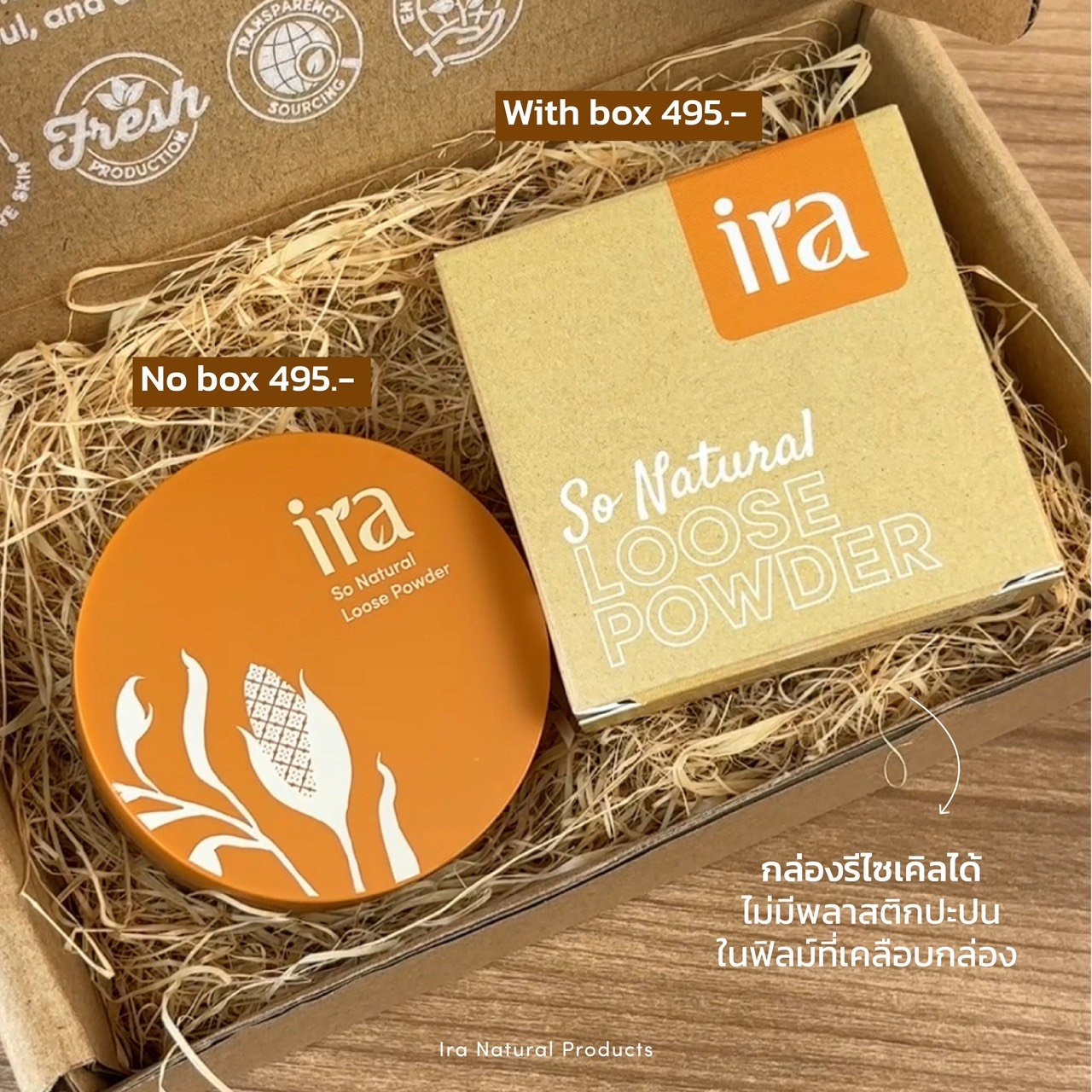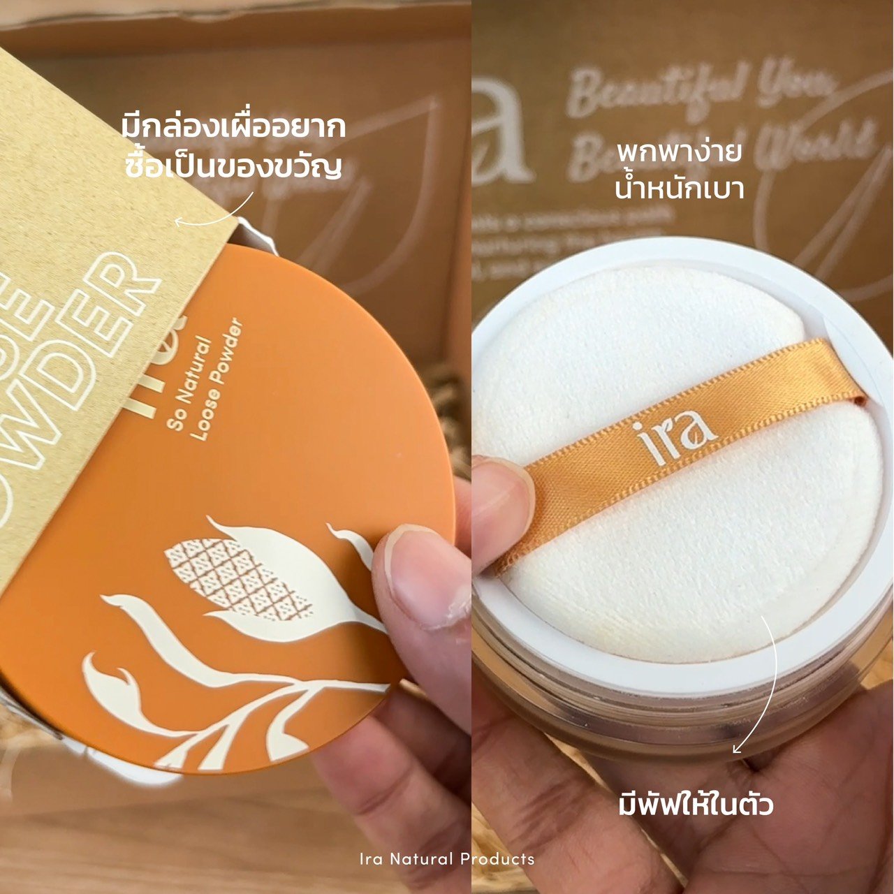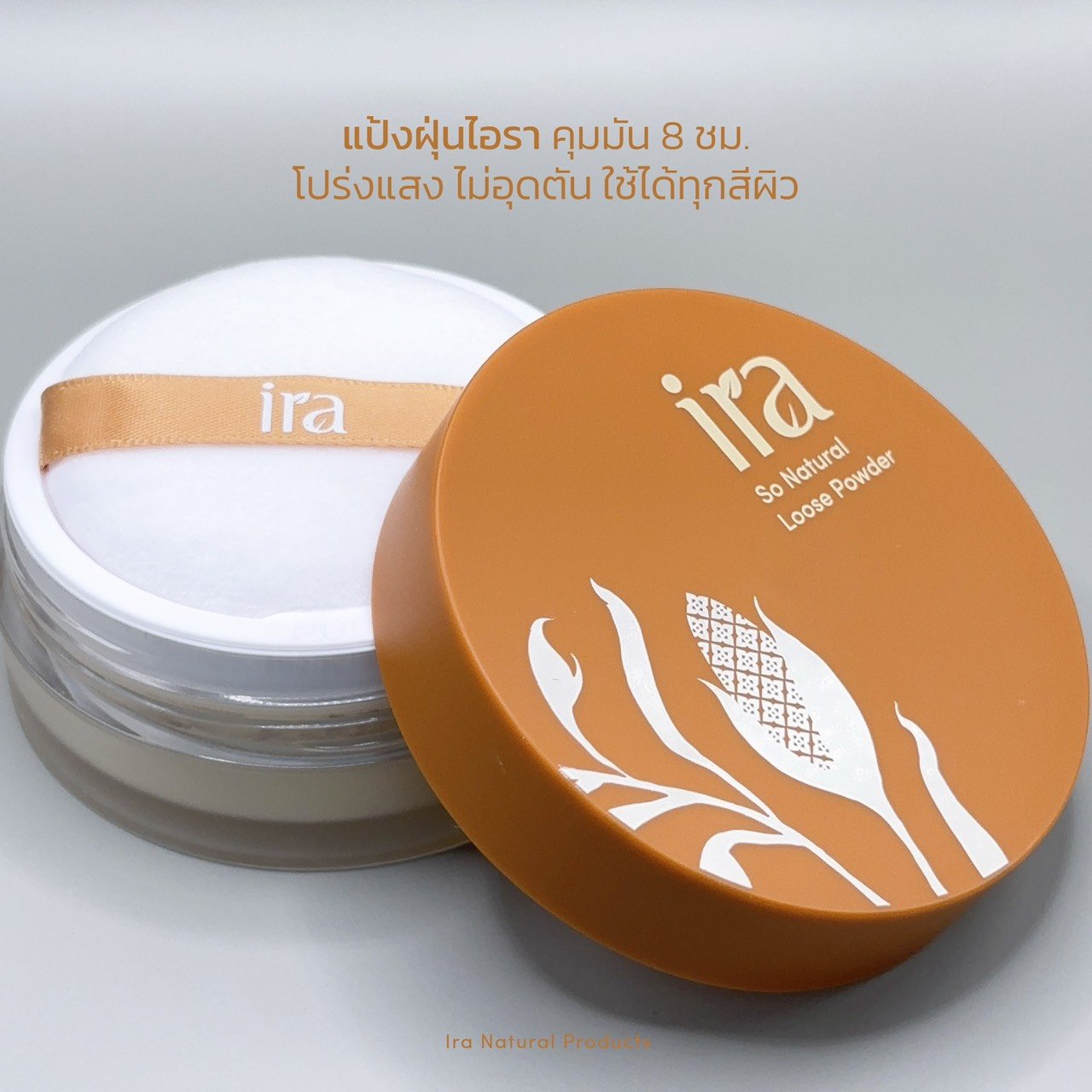ไอรา โซ เนเชอรัล ลูส พาวเดอร์จากแป้งข้าวโพดและแป้งข้าว ไร้ทัลคัมและซิลิโคน เหมาะกับผู้ที่มีผิวแพ้ง่ายหรือเป็นสิว เนื้อโปร่งแสง สำหรับเซ็ตเมคอัปให้ติดทนนาน