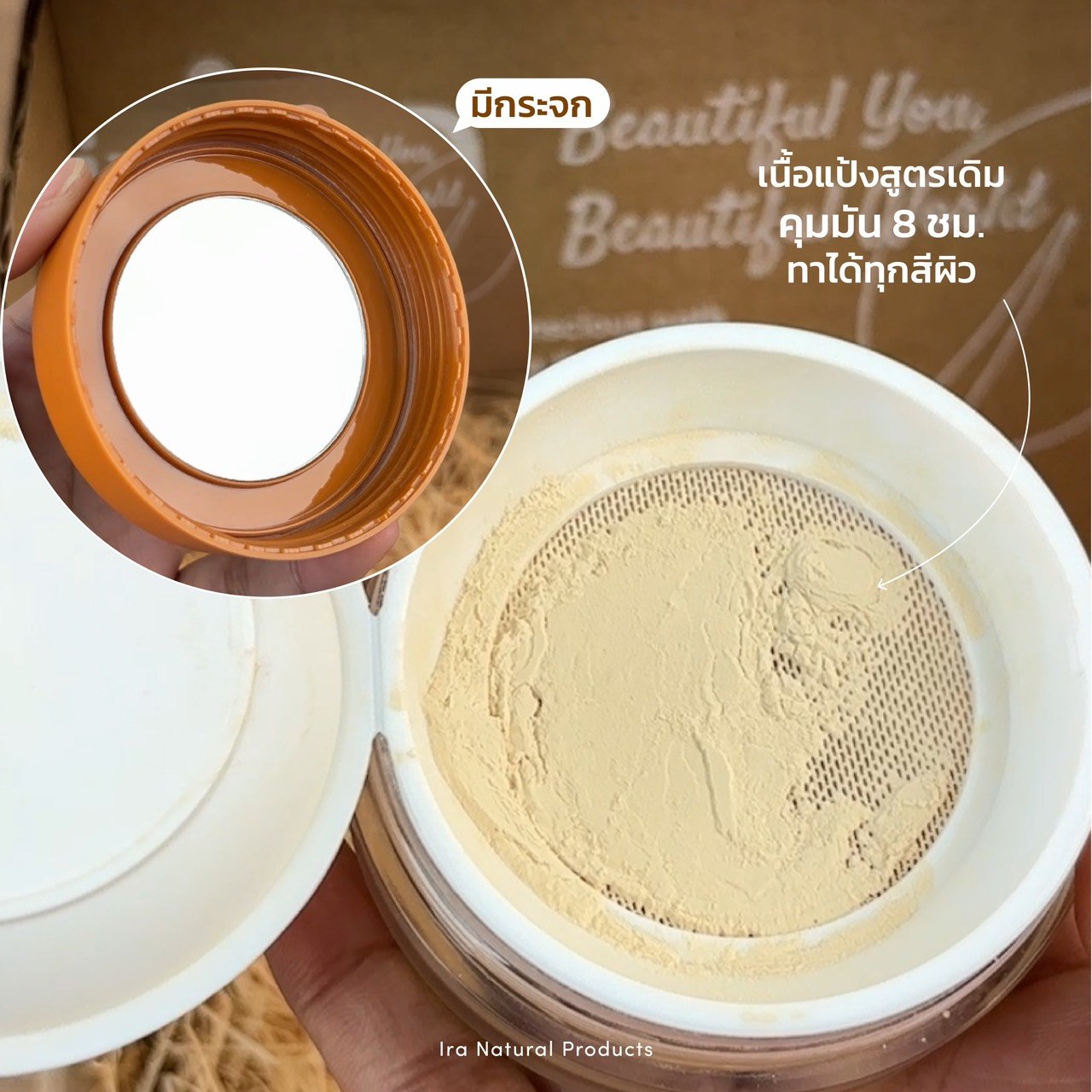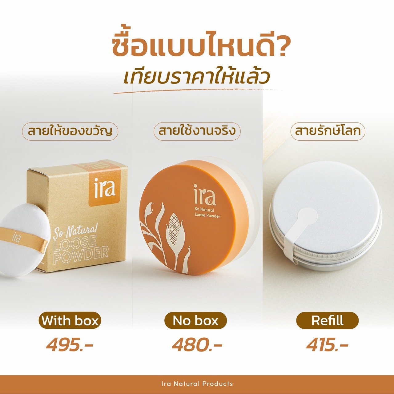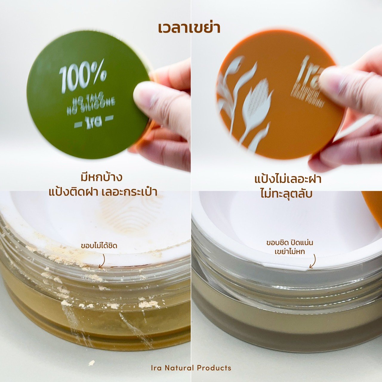 ไอรา โซ เนเชอรัล ลูส พาวเดอร์จากแป้งข้าวโพดและแป้งข้าว ไร้ทัลคัมและซิลิโคน เหมาะกับผู้ที่มีผิวแพ้ง่ายหรือเป็นสิว เนื้อโปร่งแสง สำหรับเซ็ตเมคอัปให้ติดทนนาน